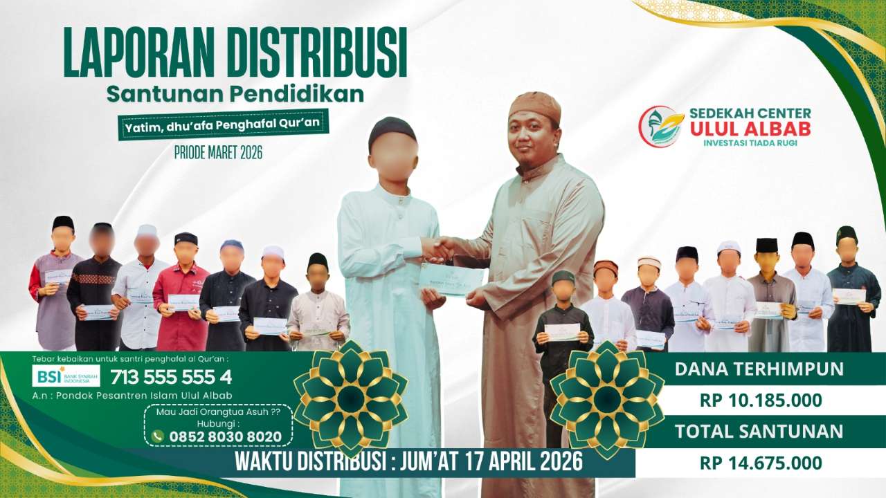 Alhamdulillah, amanah kebaikan dari para donatur telah tersalurkan kepada para santri yatim dan dhuafa penghafal Al-Qur’an di lingkungan Pondok Pesantren Islam Ulul Albab.